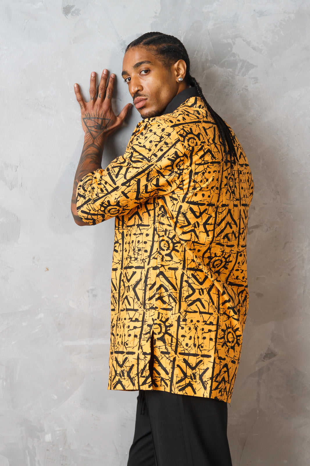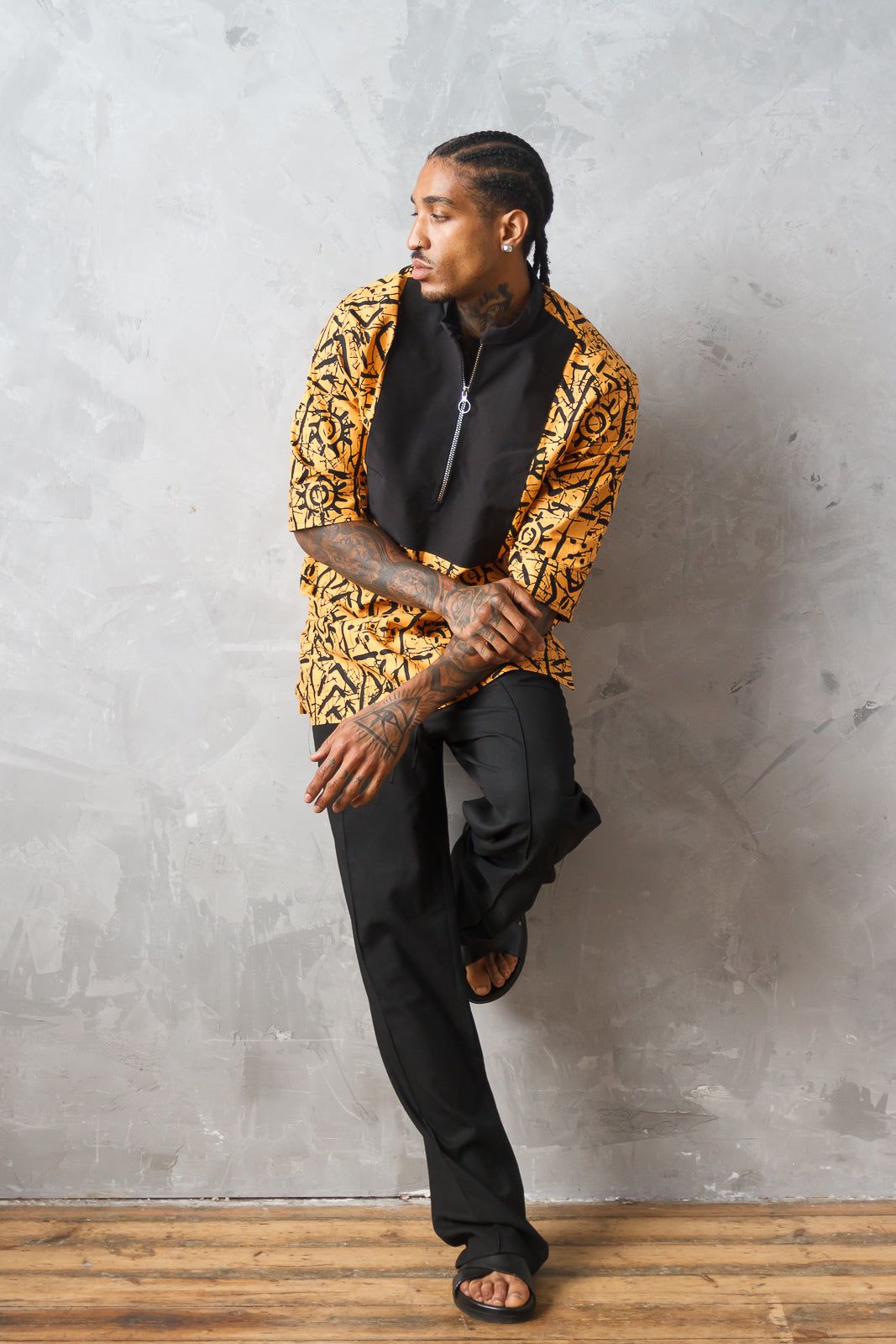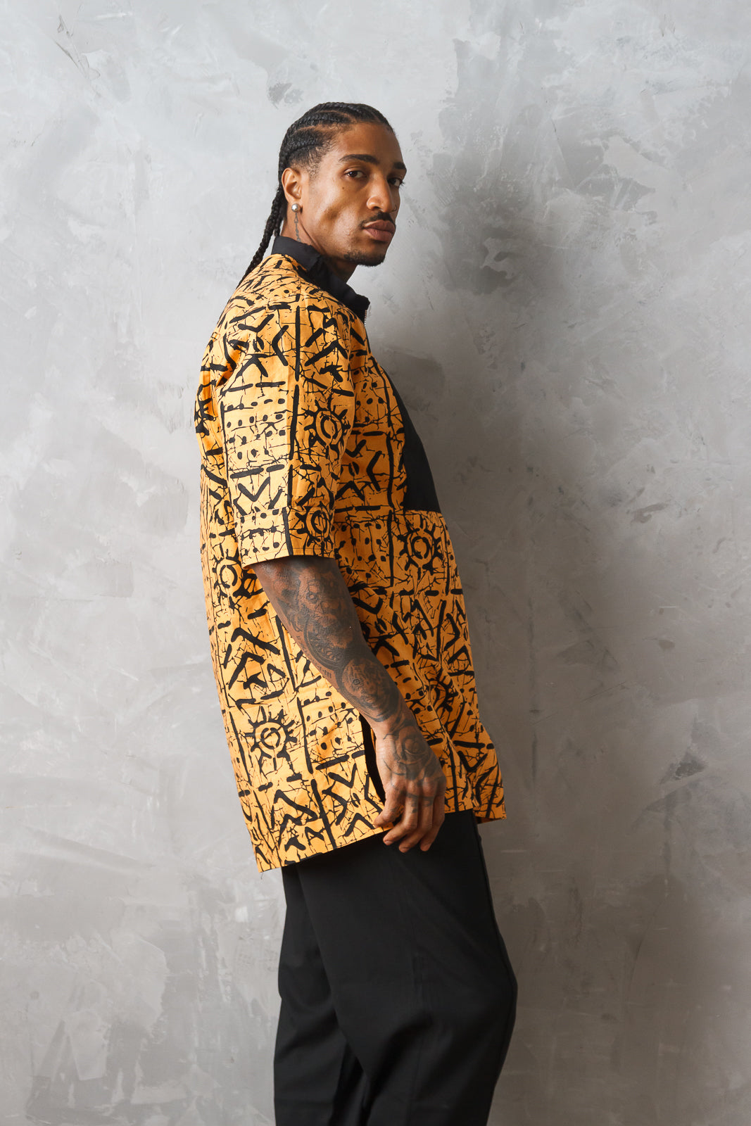 African-Print Shirt in a soft peach tone. This standout shirt features abstract geometric patterns that echo cultural identity. A black crepe panel with a sleek zipper that runs from chest to neck.