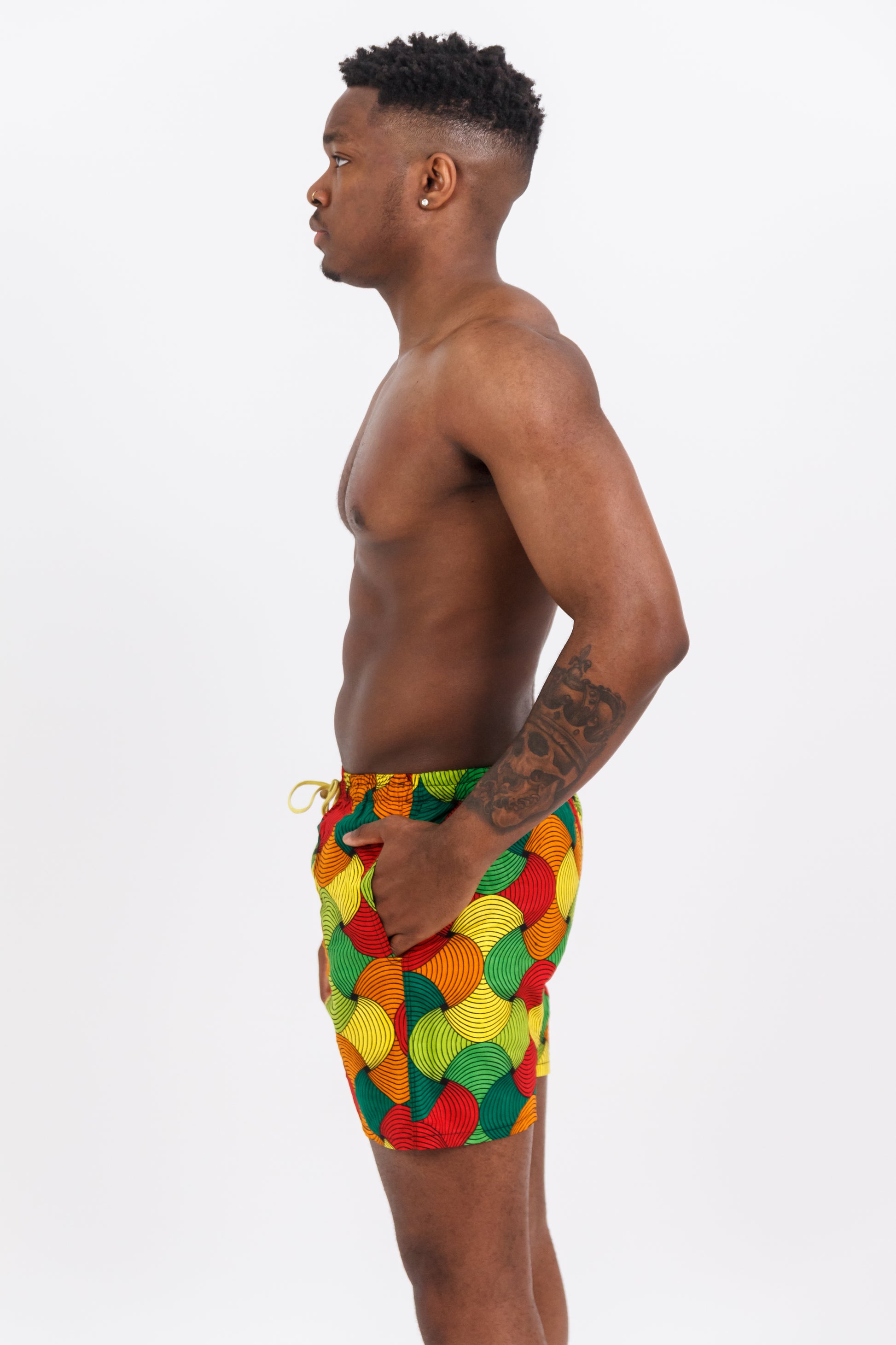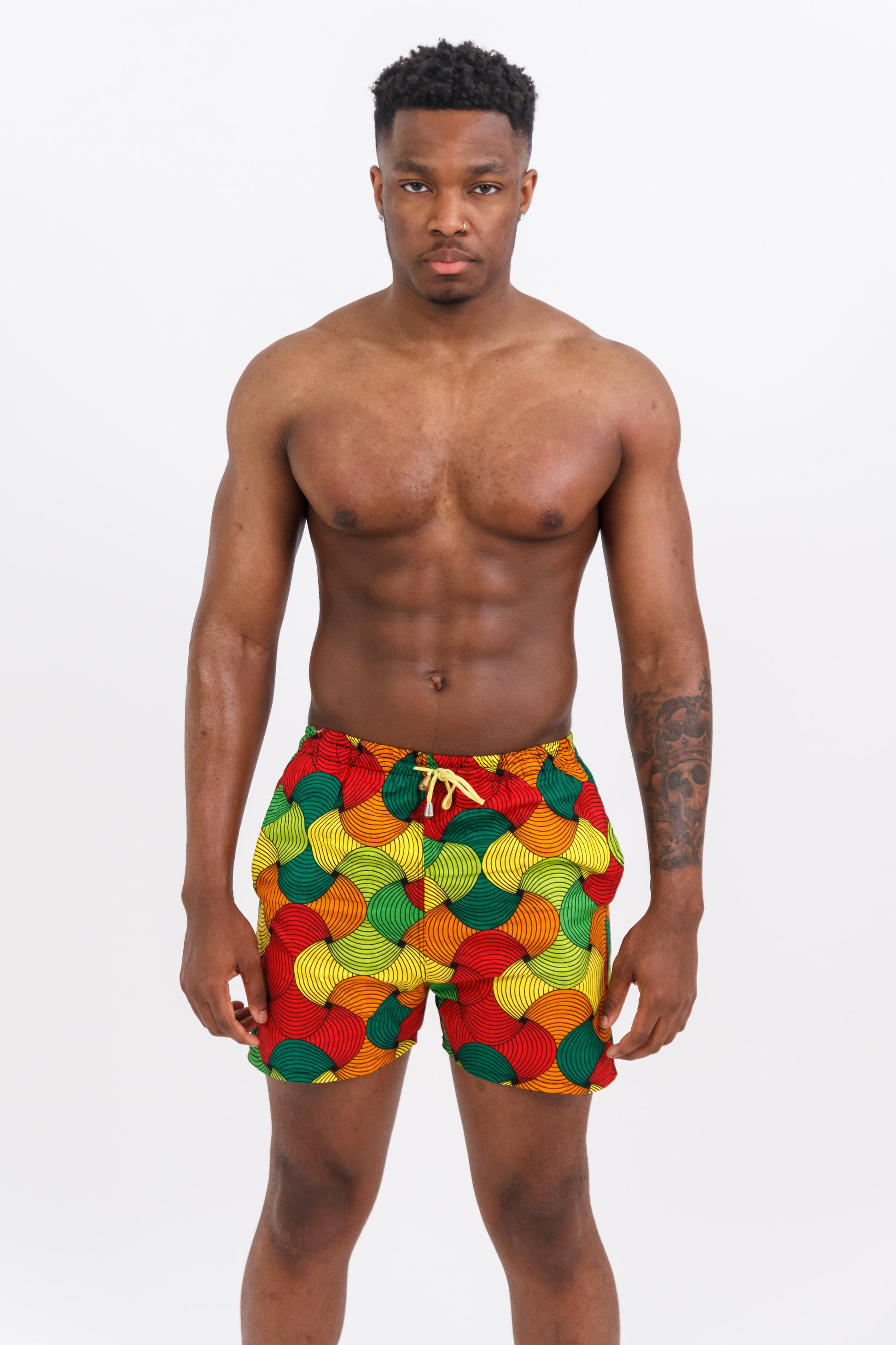 GBADUN means enjoy, and that’s exactly what these African Print Swim Shorts are made for. Show off your vibrant side in this colorful, bold statement piece designed for sunny days and unforgettable vibes. Whether you’re hitting the beach, grilling at a cookout, or chilling fireside with friends, GBADUN keeps you stylish and confident. Pair with a neutral-tone shirt or go shirtless — either way, you’ll turn heads.