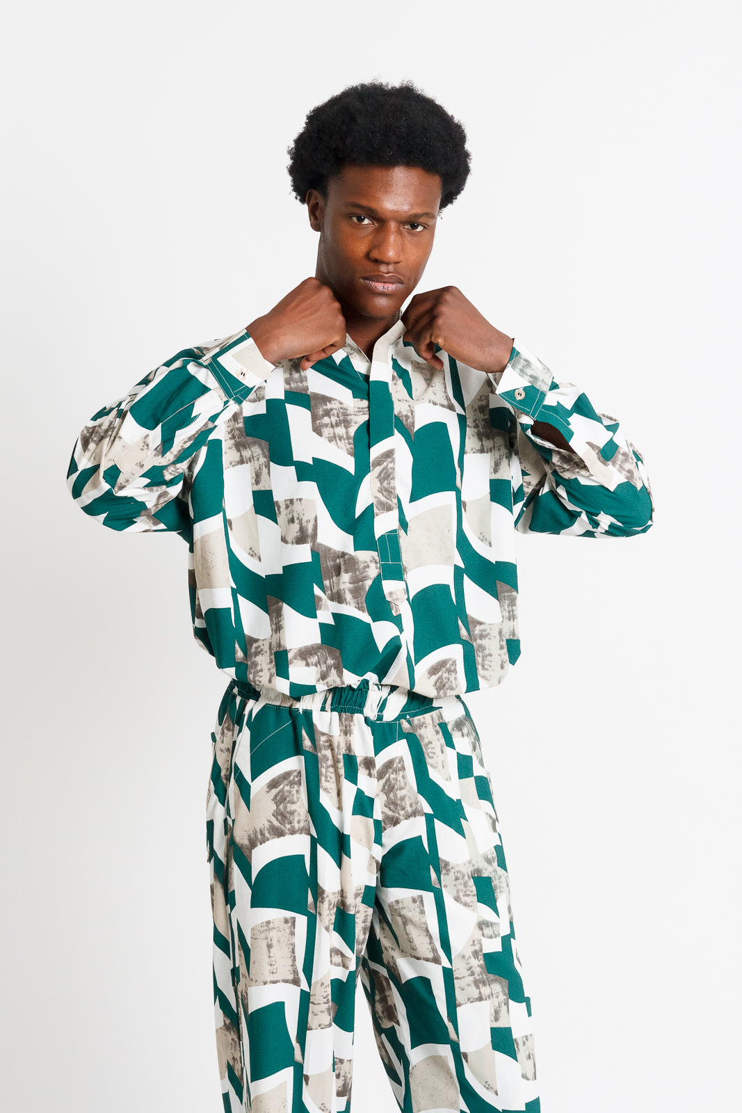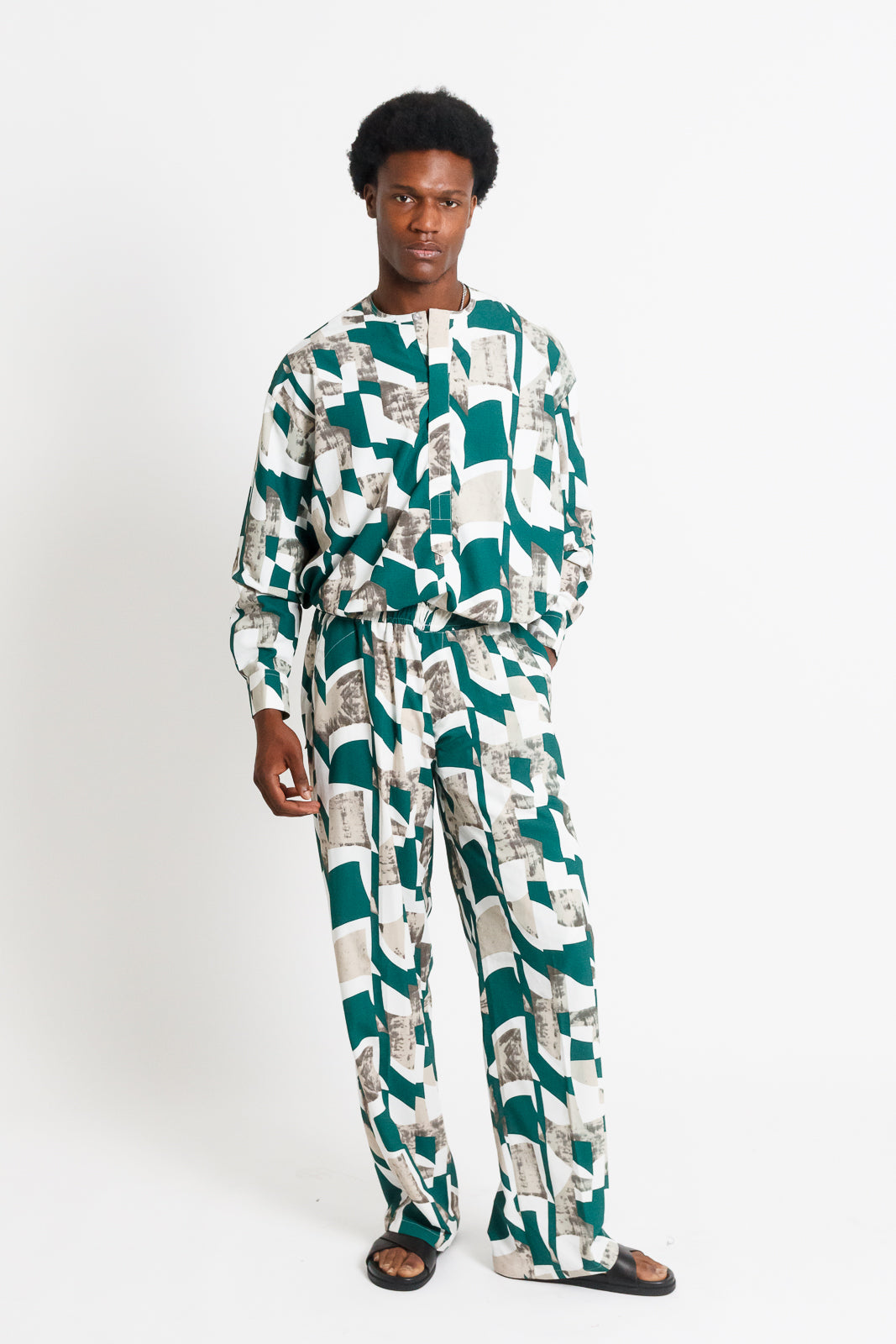 This relaxed shirt-and-trouser combo features a bold patchwork of geometric curves and cityscape textures in shades of deep green, cream, and stone. Breezy yet intentional — it's a statement made in motion.
