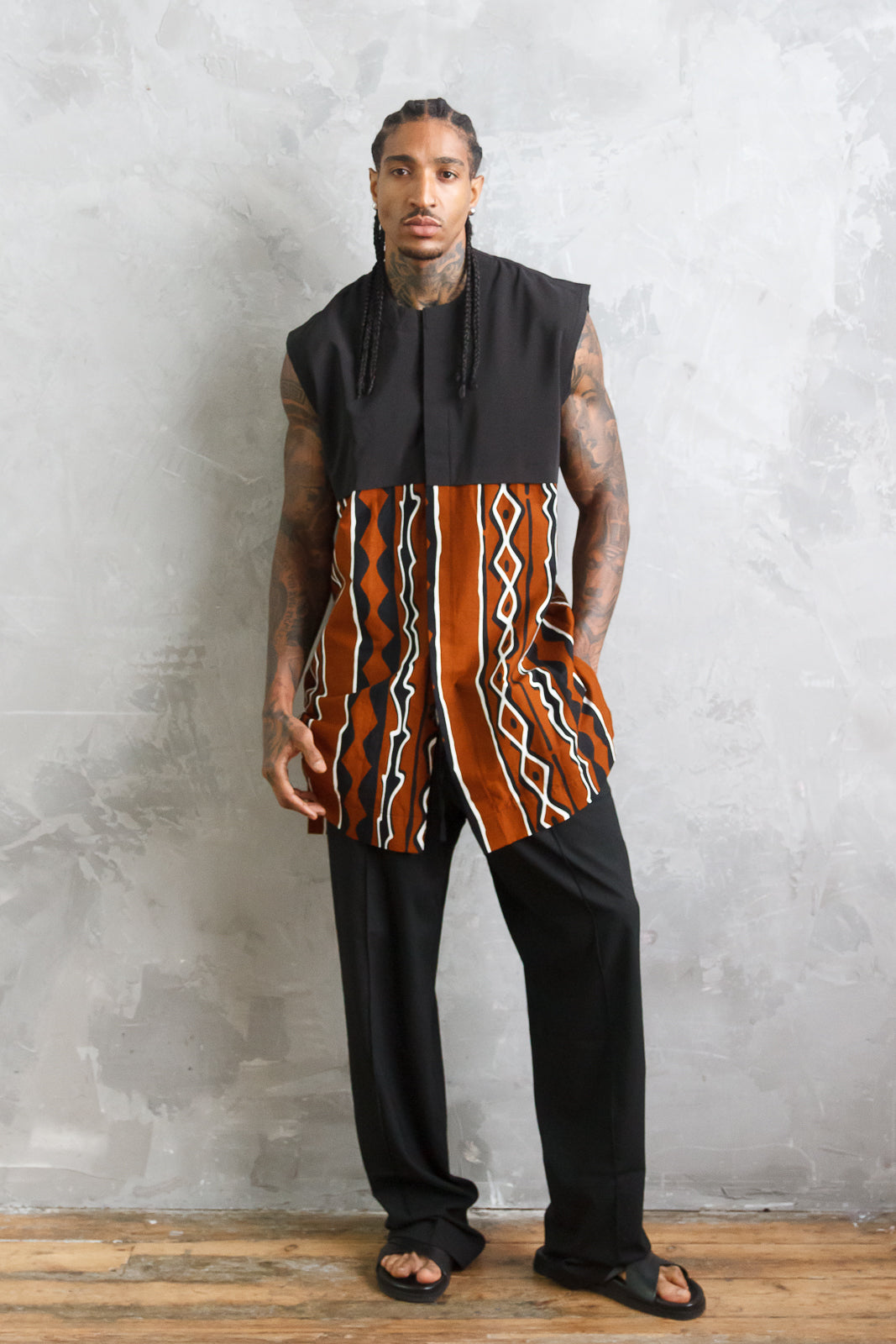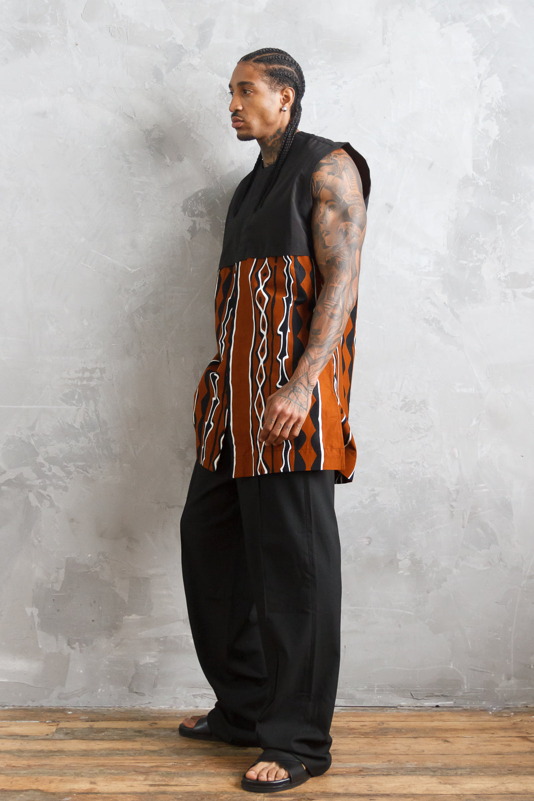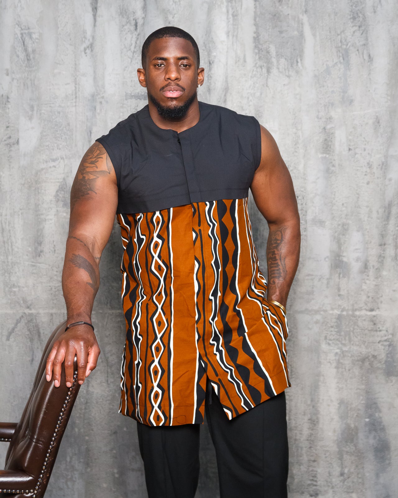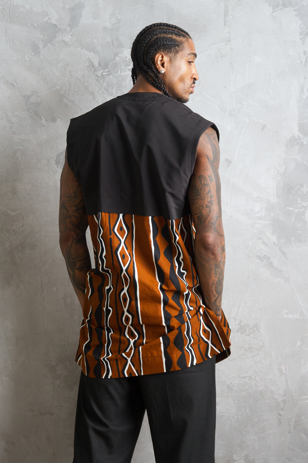 The KASALI Mud Print is a bold expression of African heritage, reimagined for today’s modern man. Crafted from premium wax African print, this sleeveless, thigh-length piece commands attention with its striking mud-print pattern and sharp silhouette.