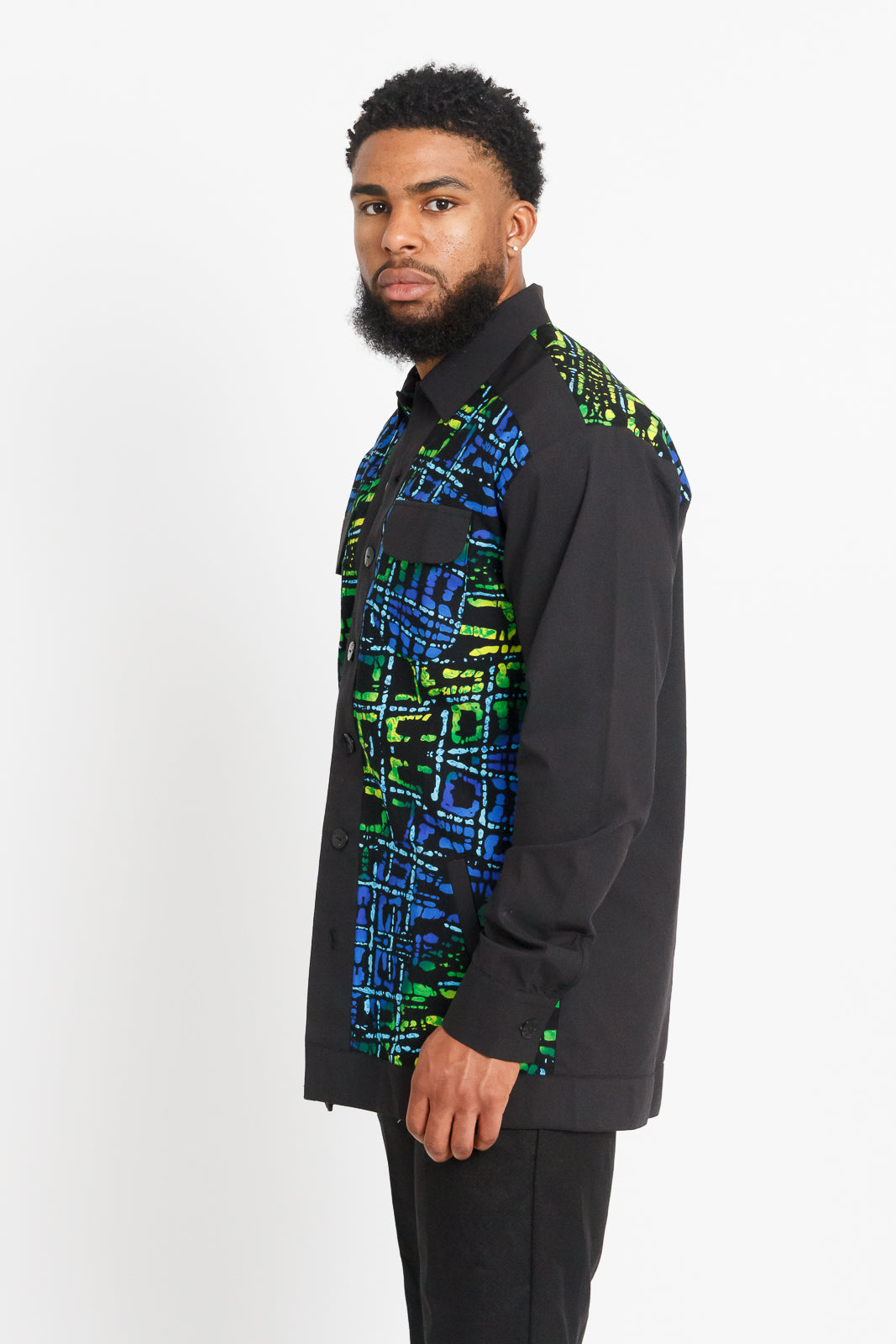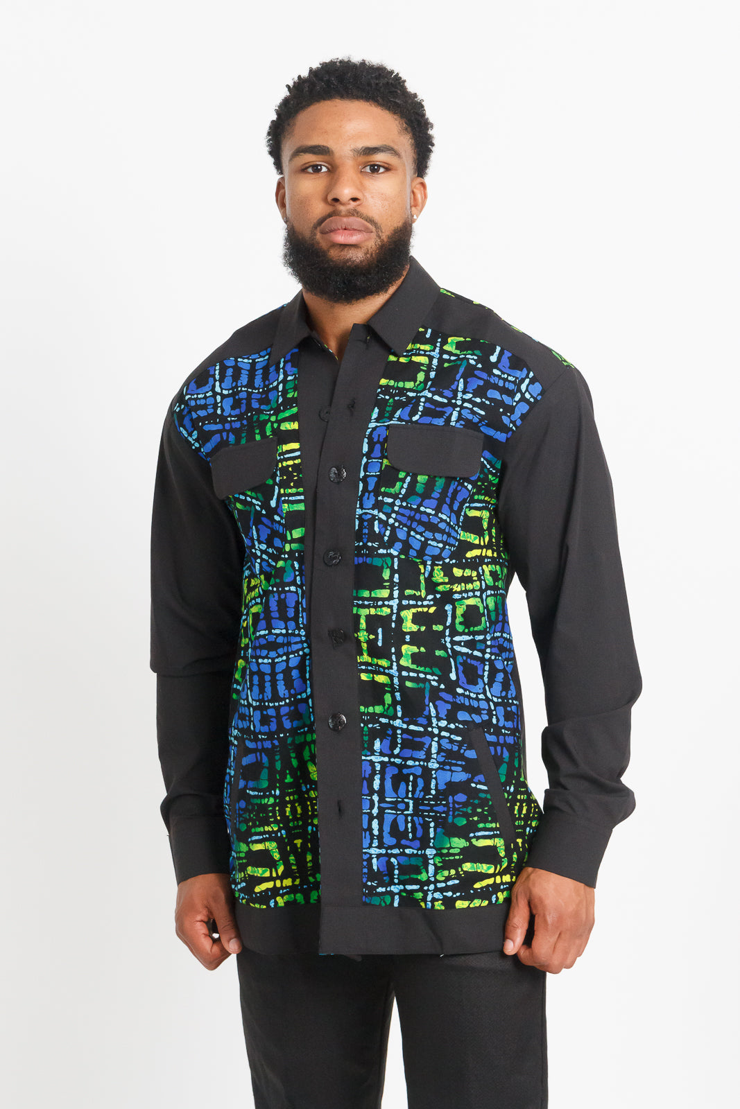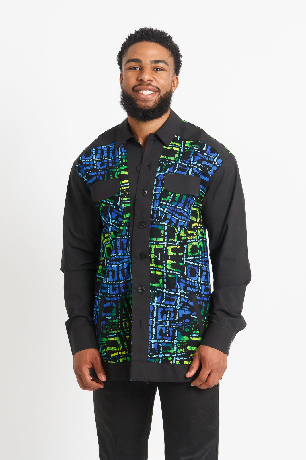 Mofe Men's Long Sleeve African Print Shirt / Jacket (Black with Colorful Geometric Panel)