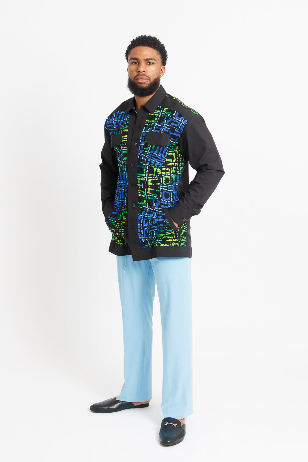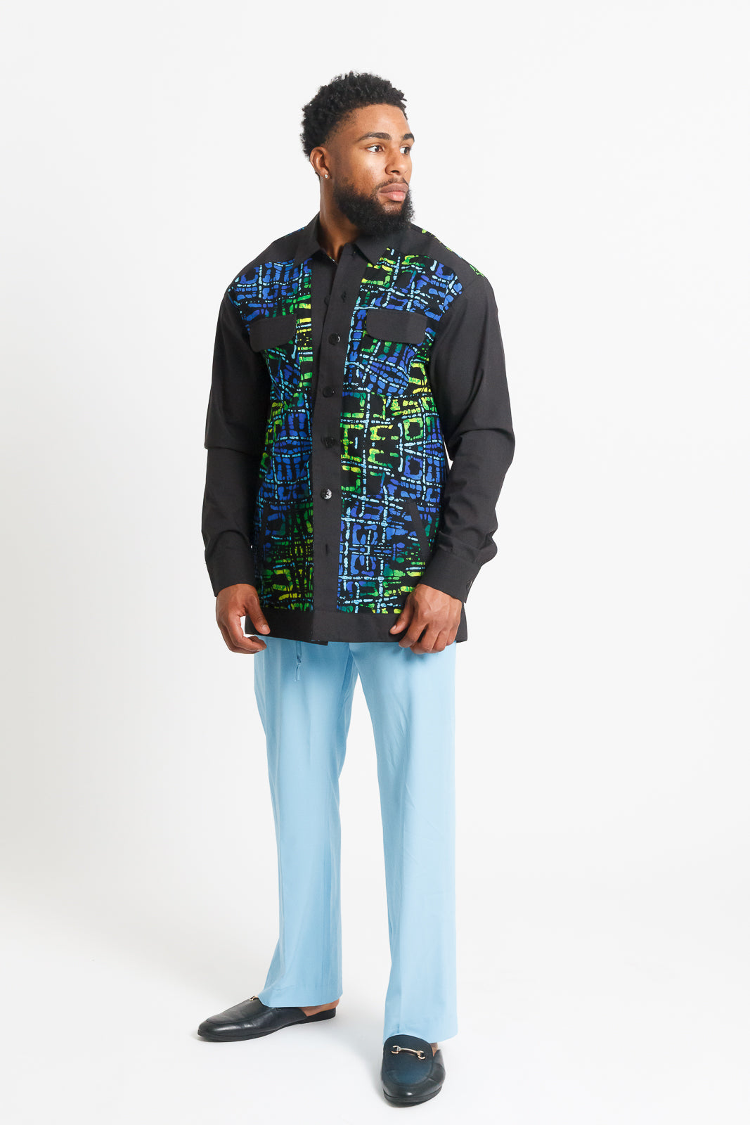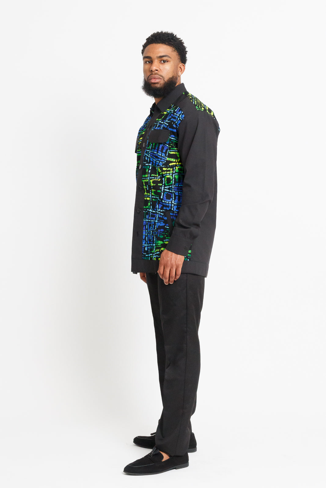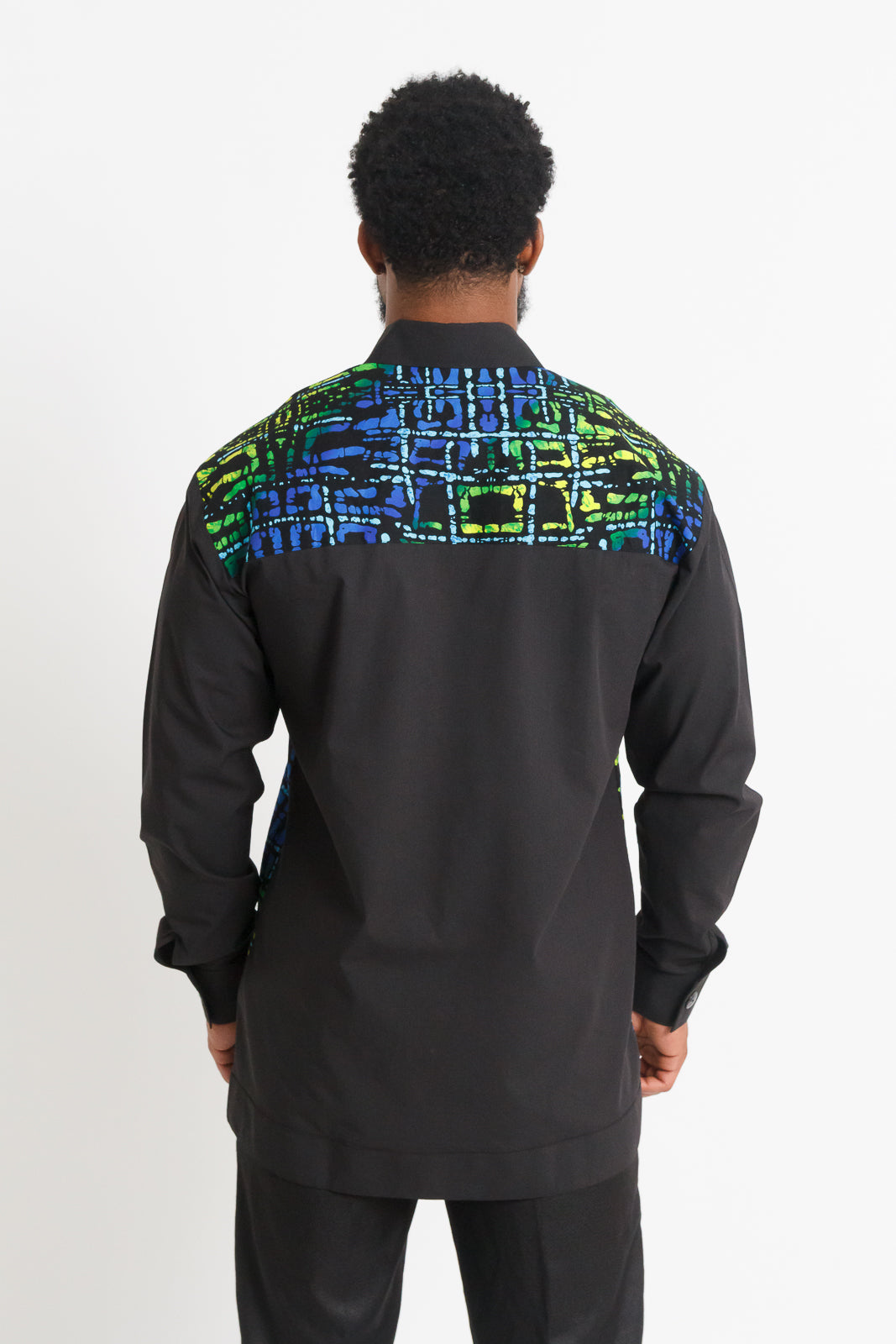 Mofe Men's Long Sleeve African Print Shirt / Jacket (Black with Colorful Geometric Panel)