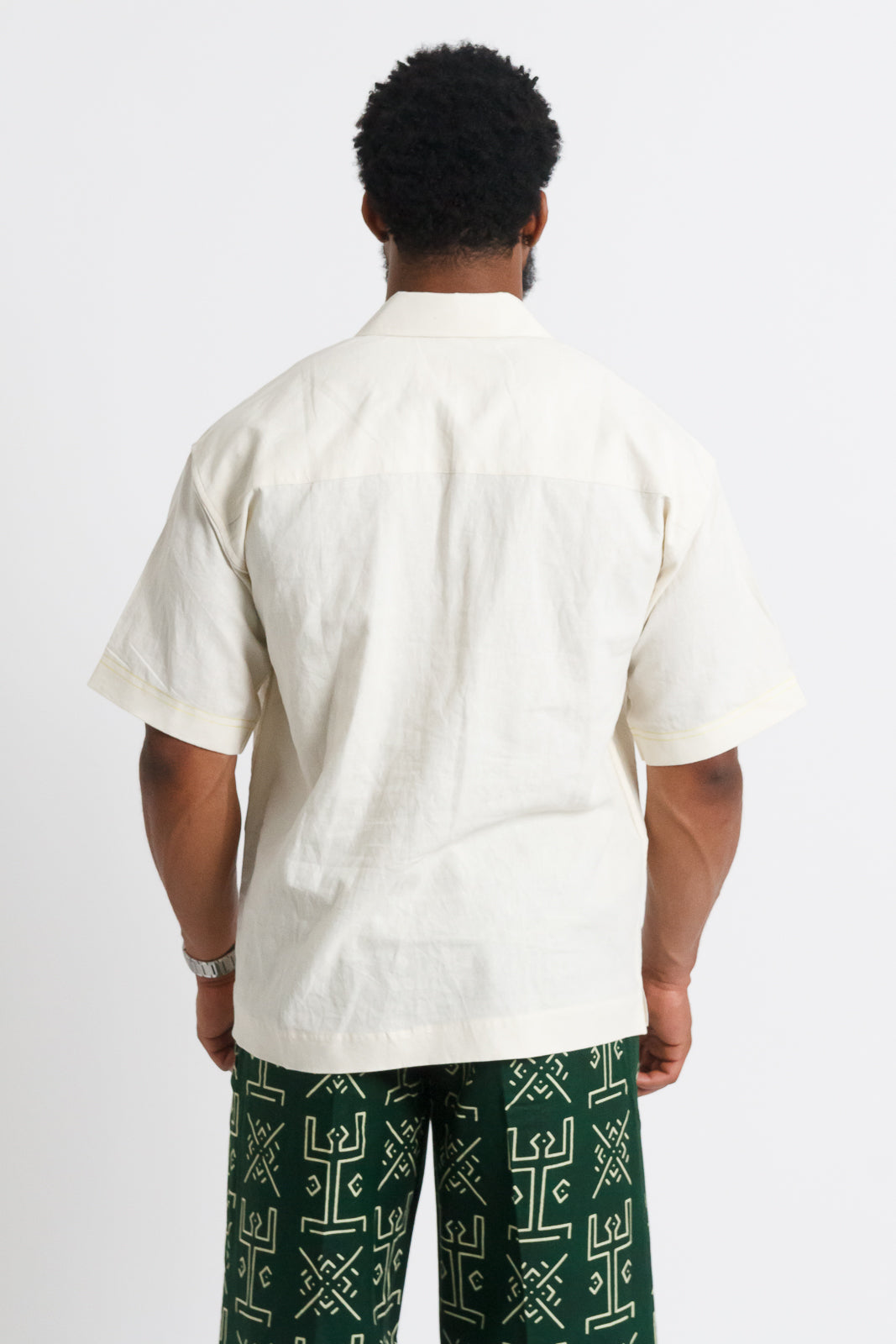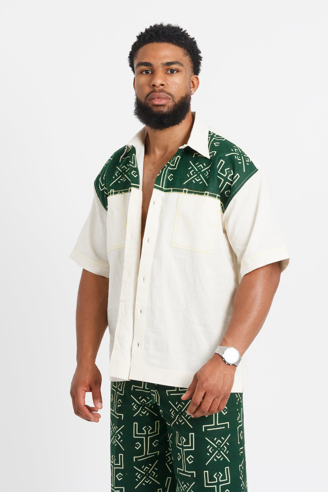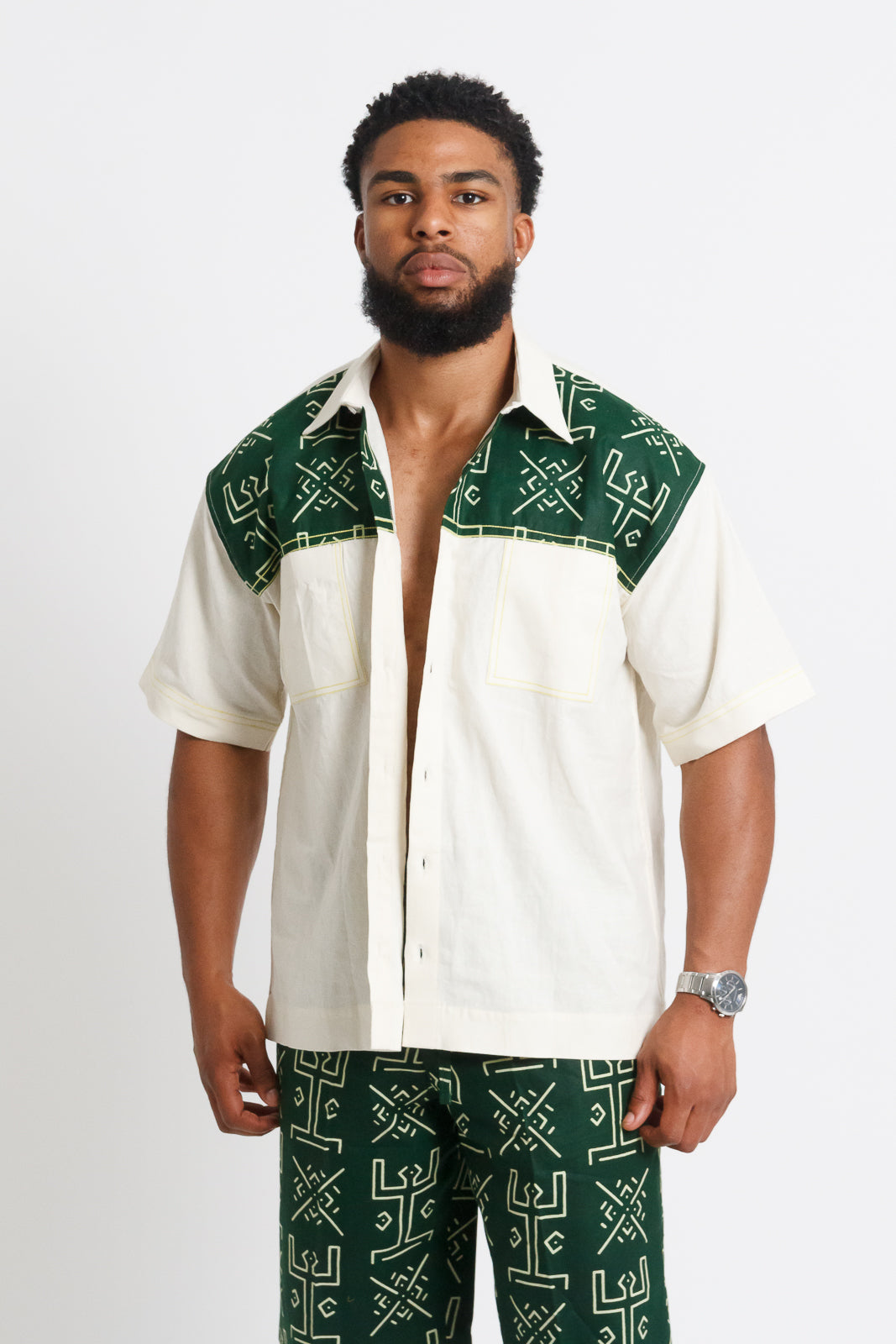 Nsibidi Men's African print Button-up Shirt (Ivory & Forest Green)
