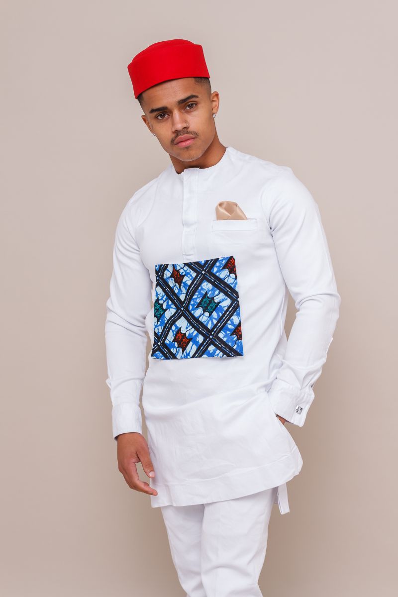 The standout detail? A bold Ankara African print square attached to the chest, which can also double as a pocket square — blending modern design with cultural sophistication.