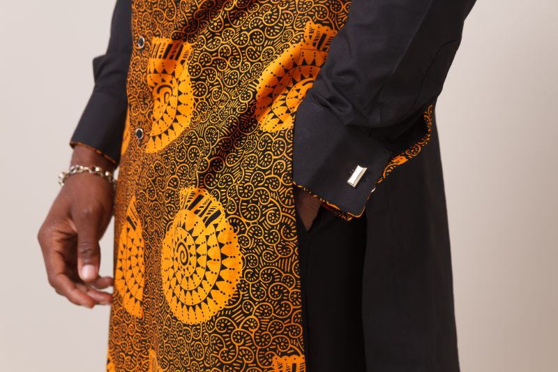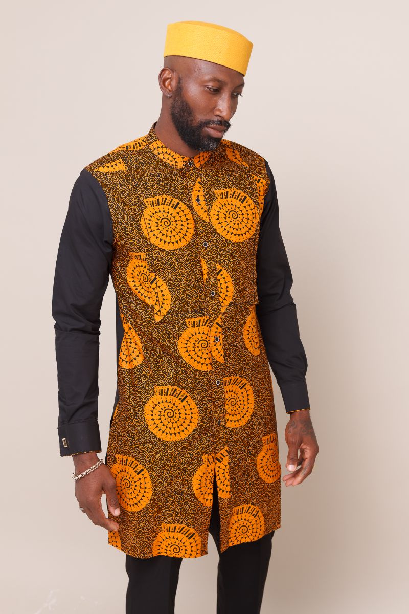 A true blend of comfort, elegance, and heritage, this shirt features a standout spiral shell wax print front, contrasted with sleek black sleeves and back for a sharp, modern twist.